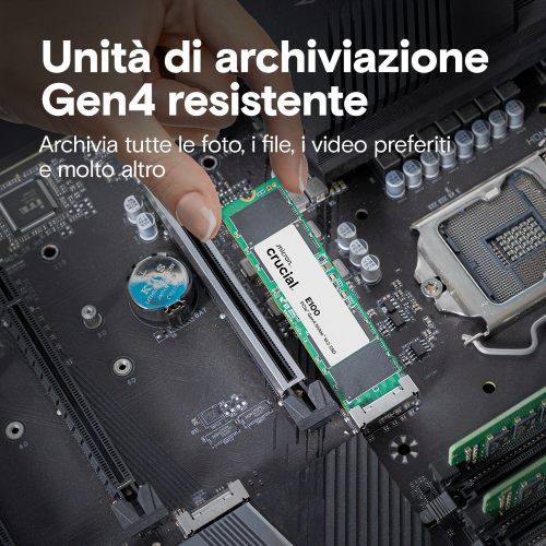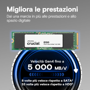 È tempo di dire addio agli SSD SATA o alle unità HDD: dai una marcia in più alle prestazioni e allo spazio digitale con l’SSD Crucial E100 Gen4. Questo SSD raggiunge velocità di lettura fino a 5.000 MB/s consentendoti al contempo di archiviare tutte le foto, i file, i video preferiti e molto altro.