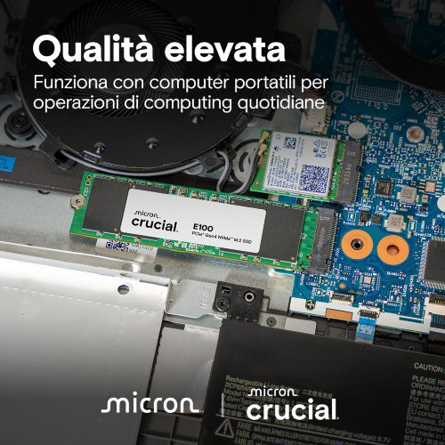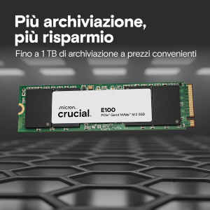 È tempo di dire addio agli SSD SATA o alle unità HDD: dai una marcia in più alle prestazioni e allo spazio digitale con l’SSD Crucial E100 Gen4. Questo SSD raggiunge velocità di lettura fino a 5.000 MB/s consentendoti al contempo di archiviare tutte le foto, i file, i video preferiti e molto altro.